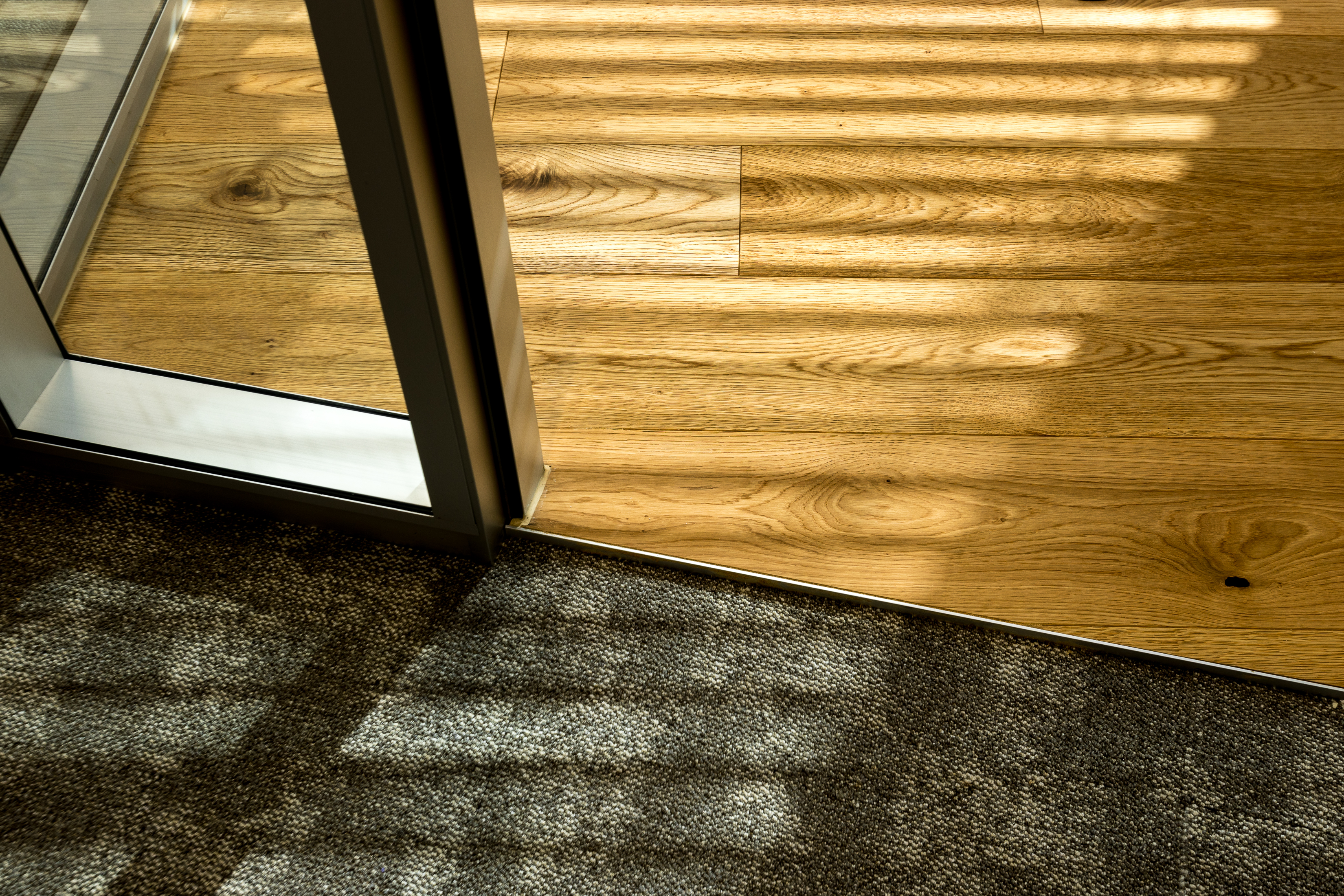 Matériau : 285 m² de dalles de moquette Condor Graphic Tiles, couleur : Imagination, 80 m² de parquet à lames larges à 2 couches, brossé, huilé naturel.