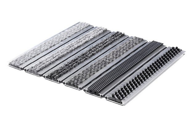 Die Aluminiumprofile der Aluflexmatten sind durch einen Gummistreifen über die gesamte Länge der Aluminiumprofile miteinander verbunden. Dadurch ist es möglich, die Matte in eine individuelle Form zu schneiden, ohne ihre Stärke zu beeinträchtigen. Sie können Einlagen aus Teppich, Gummi, Bürsten oder Rauhaarrips wählen.