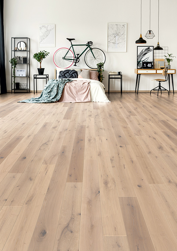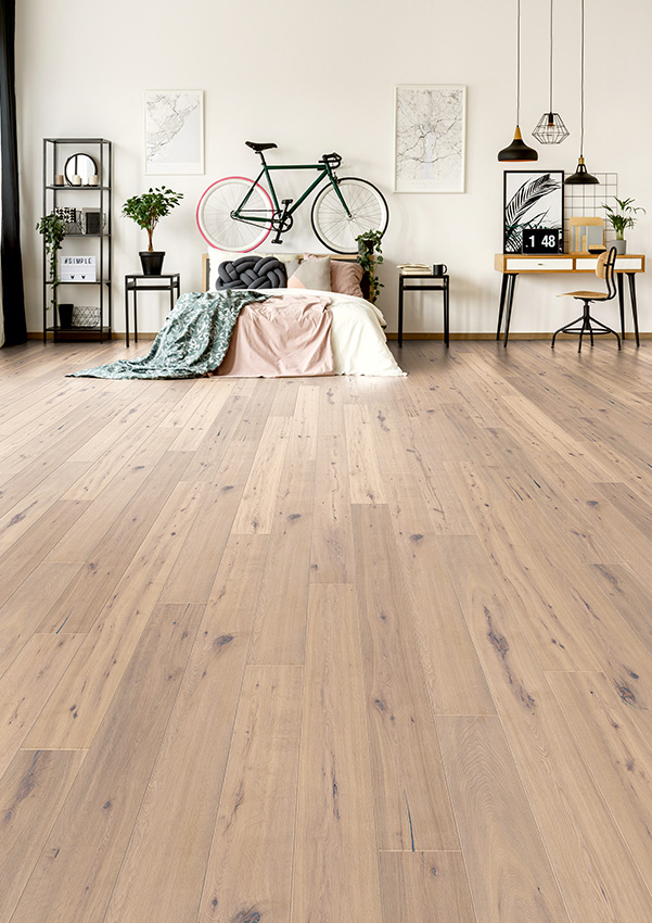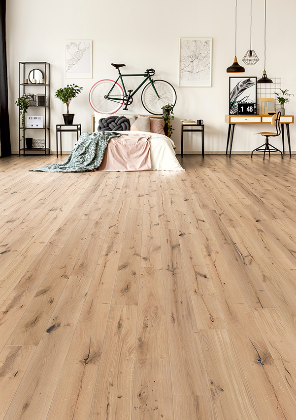 Die Oberfläche ist entweder UV‑geölt oder naturgeölt (weiß). Die Dielen verfügen über eine V‑Fase an allen vier Seiten. Das Drop‑Down‑Click‑System ermöglicht eine einfache und klebstofffreie Verlegung.